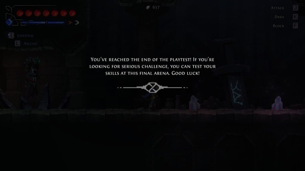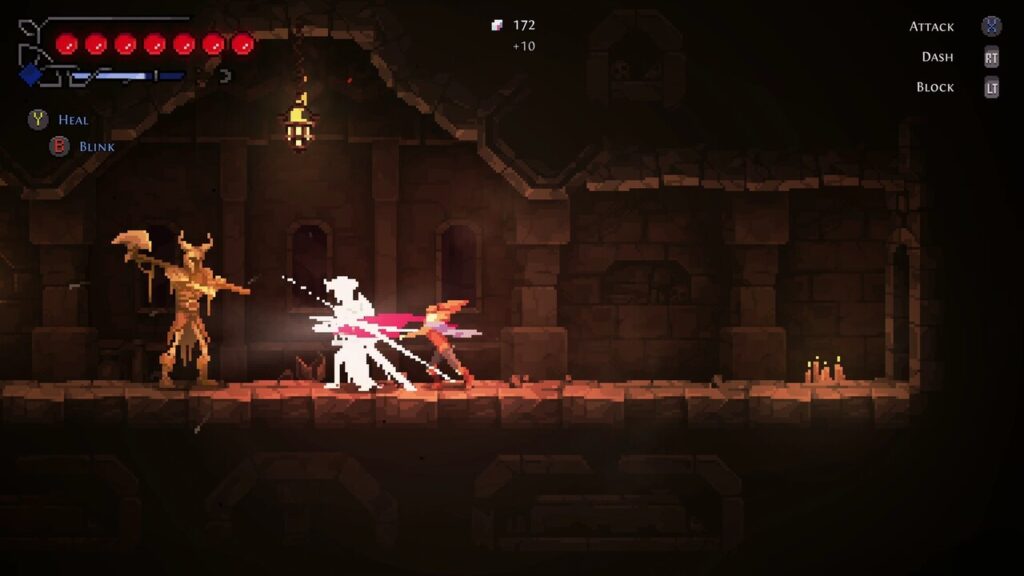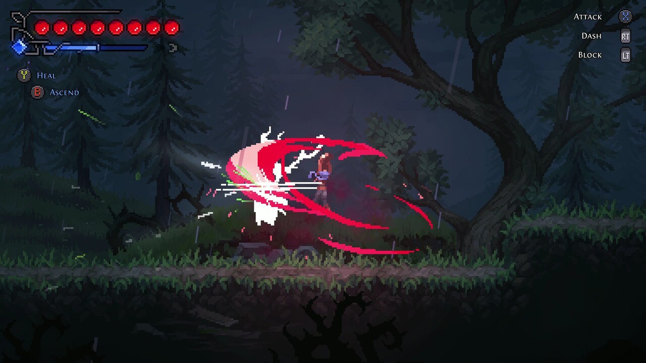 Inicialmente o jogo parecia meio duro, pois a apresentação da personagem (que seria ela parada, em idle) mostra que ela só faz um movimento para cima e para baixo, com alterações mínimas no cabelo. É um detalhe um pouco estranho de se notar, mas se comprado a outros jogos, como Momodora: RutM, observa-se que faltou um pouco de capricho nisso. Porém ao começarmos o combate podemos notar que ele é extremamente delicioso.