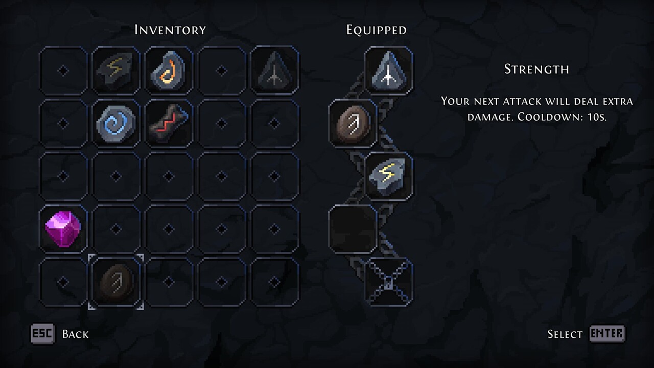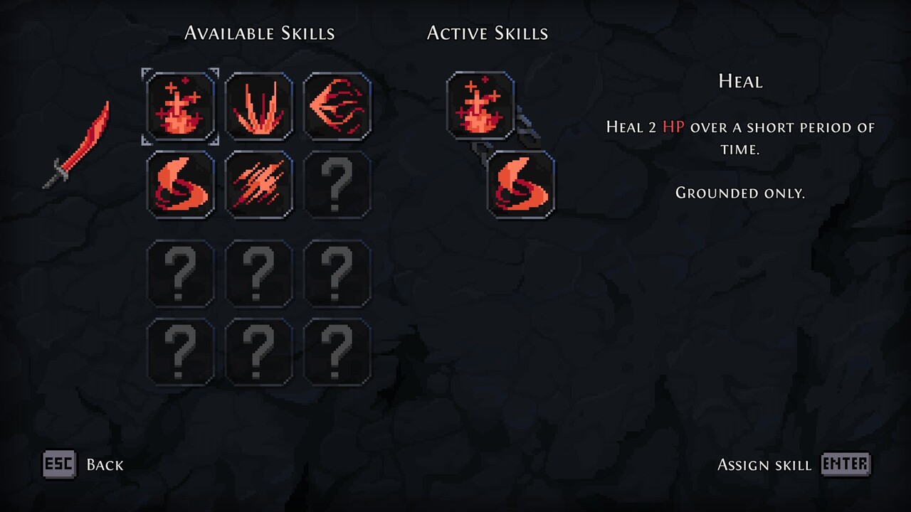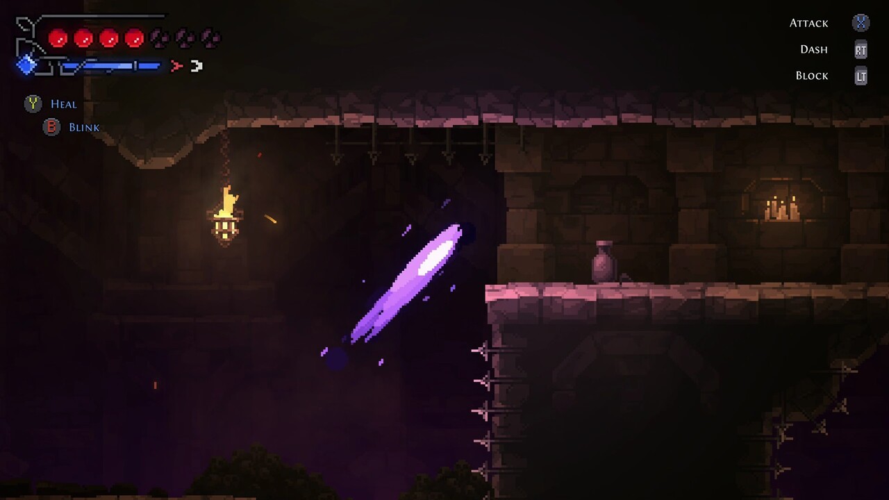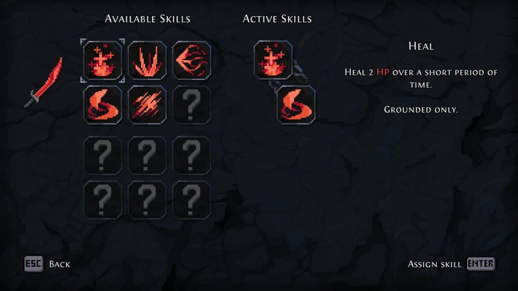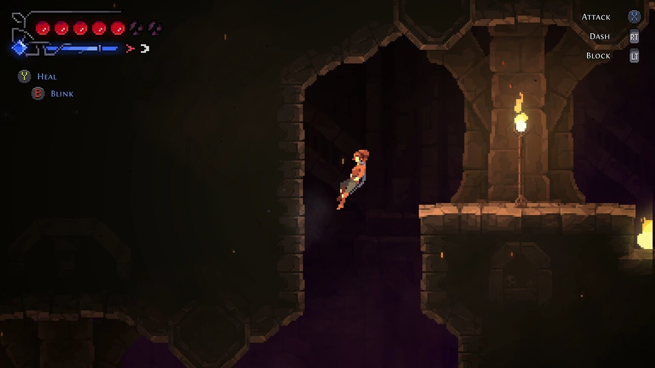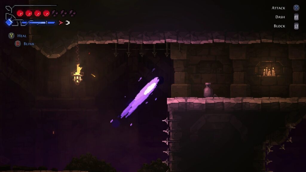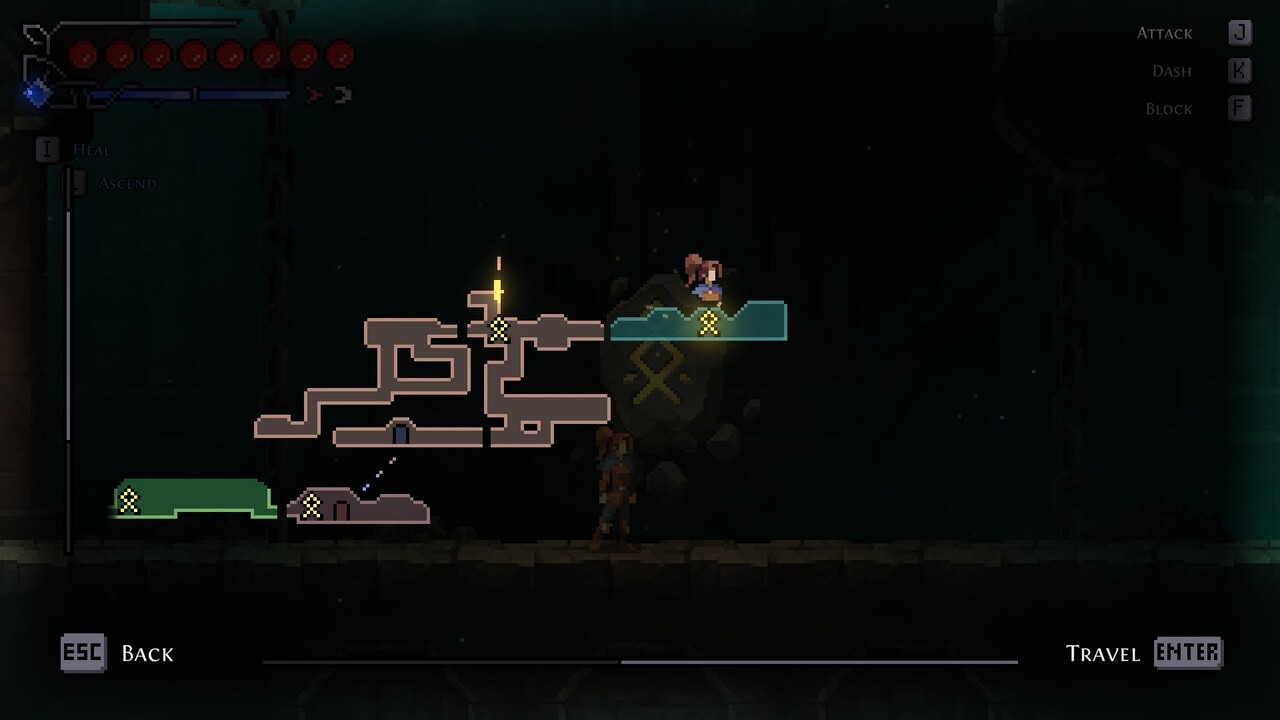 E como um bom metroidvania, ainda existem habilidades que são adquiridas ao decorrer do jogo para que possa acessar locais que antes não podiam ser alcançados, como o wall jump e dash, sendo esse ultimo para qualquer direção. Só achei meio esquisito o fato do mapa só poder ser acessado nos Glifos (que seria os savepoints).