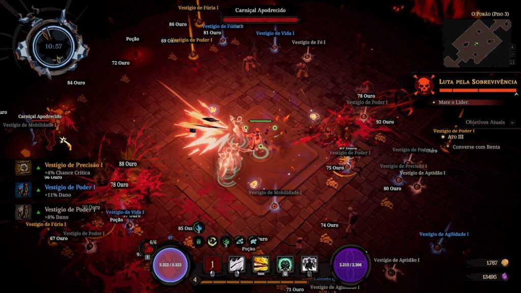 O jogo possui 3 atos com 21 andares em cada um deles. No inicio o seu personagem começa com 10 habilidades liberadas e ao completar um ato libera mais 6 habilidades, ficando com um total de 22 habilidades variadas que podem ser utilizadas durante o jogo. A forma que escolheram para libera-las é estranha, porque se faz necessário pensar em uma nova build em cada ato, caso queira mudar a sua “habilidade principal”, mas da forma que joguei não atrapalhou muito, pois escolhi o Tiro Disperso e fiz uma build ao redor dele, mas caso quisesse um estilo de gameplay diferente, teria que refazer as builds nos atos seguintes.