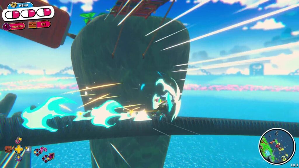 - Dash: Um impulso horizontal essencial para alcançar plataformas distantes ou atacar inimigos. Quando usado em trilhos, funciona como o grinding da série Sonic, conferindo alta velocidade.